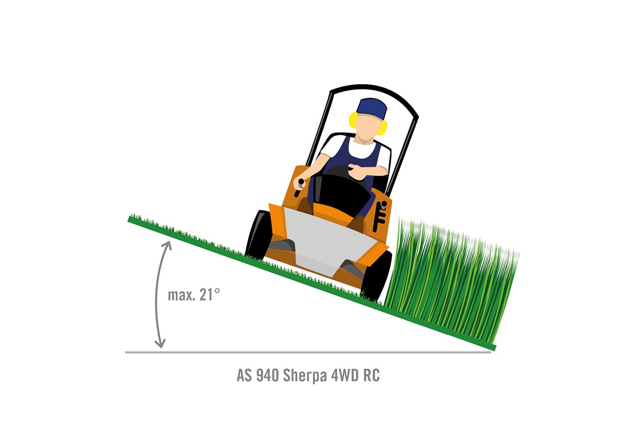 Eftersom operatören sitter på en ride-on-gräsklippare måste den alltid vara lämplig för sluttningen. Ett lågt tyngdpunkt och specialfunktioner som fyrhjulsdrift, differentialspärr och\/eller specialdäck säkerställer att gräsklipparen behåller greppet även på branta sluttningar. Information om gräsklipparens stabilitet måste alltid vara känd. Vältningsgränsen för en ride-on-gräsklippare definieras som när styrningen är vriden helt åt ett håll; enheten kan inte välta om inte detta stabilitetsvärde överskrids. Men det finns skillnader även bland liknande modeller, som illustreras av AS-Motor Sherpa-familjen: AS 915 Sherpa 2WD och AS 920 Sherpa 2WD har en stabilitet på 18 grader tvärs över sluttningen, AS 940 Sherpa 4WD har en stabilitet på 20 grader och XL-versionen och fjärrstyrda RC-modellen har en stabilitet på 21 grader i ride-on-läge. Om AS 940 Sherpa 4WD RC körs fjärrstyrt är stabiliteten 33 grader.