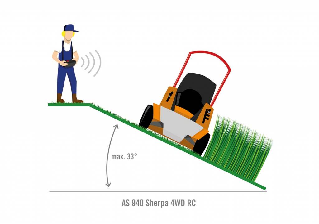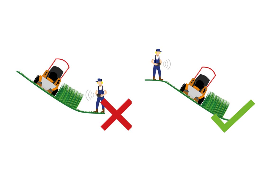 Fjärrstyrda enheter möjliggör gräsklippning både tvärs över sluttningen och upp och nedför. Försiktighet bör iakttas vid körning på färskt klippt gräs som kan minska greppet, vilket riskerar att gräsklipparen halar. Vid arbete tvärs över sluttningen bör gräsklippningen göras från topp till botten så att klippt gräs deponeras ovanför gräsklipparen. Dessutom är det viktigt att inte gå under eller framför gräsklipparen. I fallet med roterande gräsklippare bör även högra sidan undvikas, eftersom bladens medurs rotation accelererar klipp och främmande föremål åt höger och höger bak. Därför är den säkraste positionen för användaren bakom maskinen på vänster sida. Fjärrstyrda gräsklippares räckvidd bör aldrig utnyttjas fullt ut, även vid gräsklippning på välkänd terräng. Anledningen är: Endast operatören som går nära gräsklipparen kan upptäcka främmande föremål i god tid.
