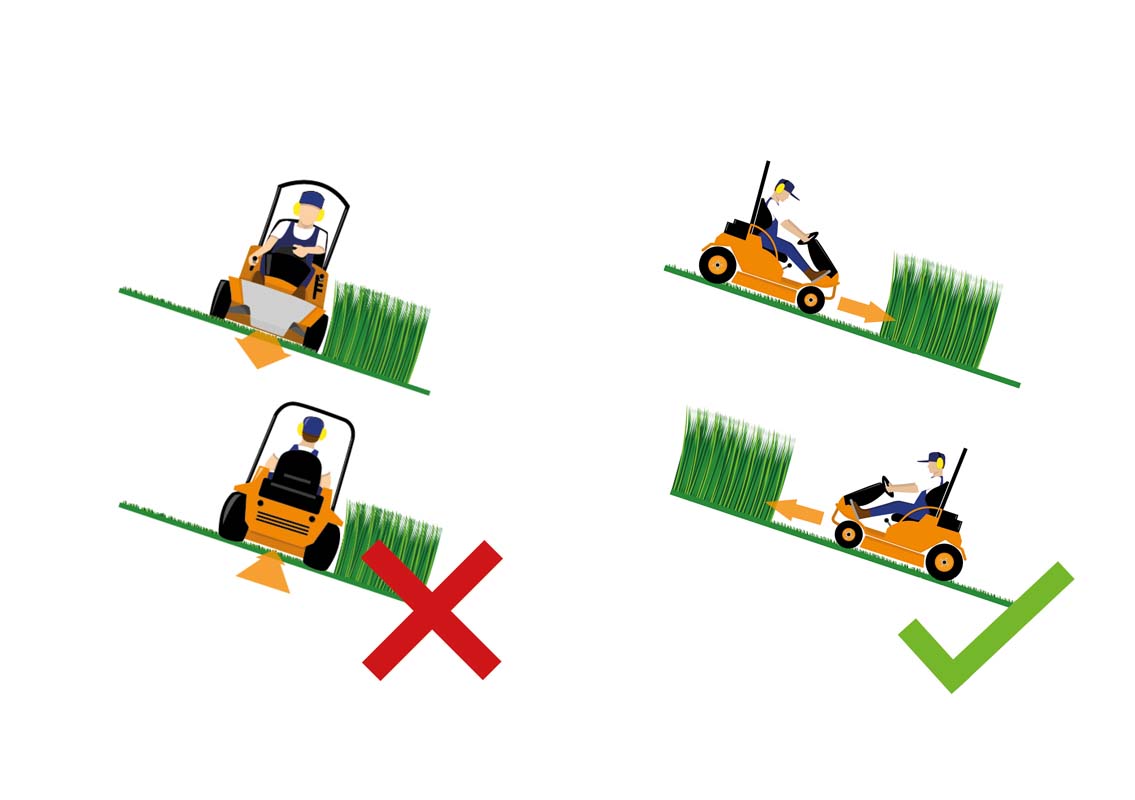 När terrängen är brant blir operatörens sittposition svår att behålla vid arbete tvärs över sluttningen. Därför måste ride-on-gräsklippare köra uppför och nedför sluttningar. Operatörer bör vara försiktiga så att de undviker ojämn mark som oavsiktligt kan få gräsklipparen att luta i en extrem vinkel, särskilt vid svängar. Men eftersom upp- och nedförkörning i ride-on-läge också ställer fysiska krav på operatören, är det särskilt fördelaktigt att ha en ride-on-gräsklippare som kan växlas till fjärrstyrningsläge i brant terräng.
