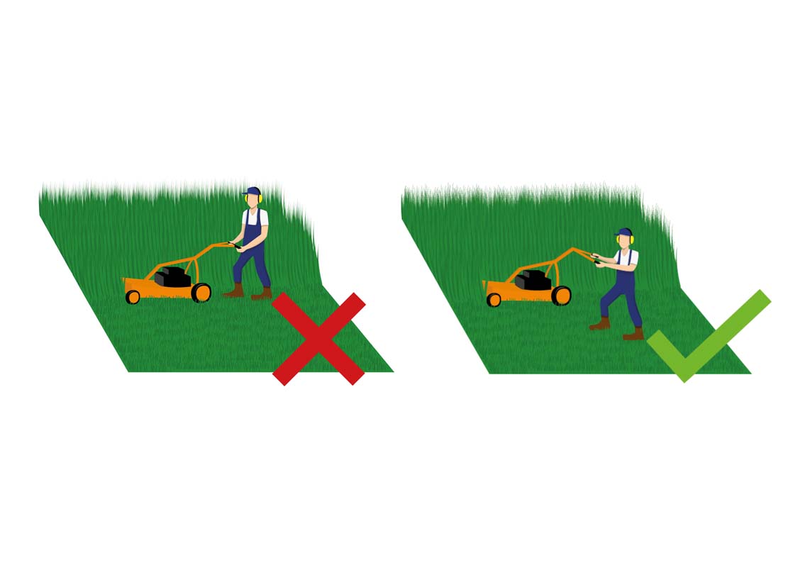 Efter en viss lutning bör handstyrda enheter alltid arbeta tvärs över sluttningen. Detta är mindre ansträngande för operatören än att styra gräsklipparen upp och ner för sluttningen. Svängar bör utföras uppför sluttningen eftersom enheten kan accelerera när den är vänd nedför; i extrema fall kan gräsklipparen till och med svänga runt. Användaren bör inte gå direkt i spåret av gräsklipparen; snarare, ju brantare sluttningen är, desto mer bör operatören stödja sig mot sluttningen genom att gå lite lägre. Att vinkla styret något nedför – som när man arbetar längs ett staket eller en byggnad – förbättrar avsevärt användarvänligheten.