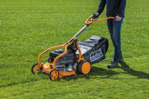 Double ball-bearing supported, smooth-running wheels press down very little grass.