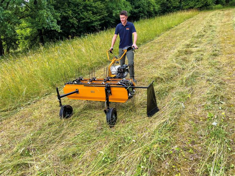 The belt rake can also be used for forage production in various functions for small-scale farming. In the first step, the machine acts as a tedder with higher engine speed and without swath cloth. With swath cloth and lower speed, the forage is then conveniently raked together.